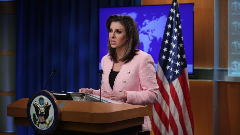 圖為美國國務院發言人奧塔格斯(Morgan Ortagus)2019年6月出席記者會時(Getty)