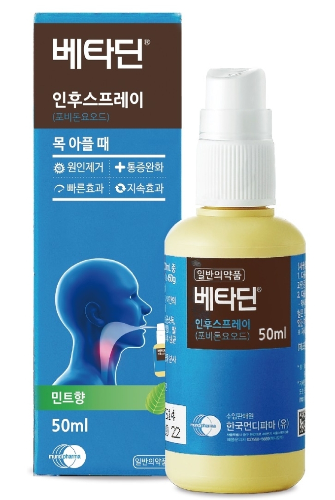 한편 한국먼디파마에서 포비돈 요오드 성분을 0.45% 함유한 구강용 제품으로 한국먼디파마에서 베타딘® 인후스프레이를 판매 중이다. 베타딘® 인후스프레이는 목이 아플 때 뿌리면 통증 등의 증상 완화 효과와 함께 원인까지 직접 제거하는 인후염 치료제로 사용되고 있으며, 감기나 인후두염 등 호흡기 질환을 유발하는 바이러스 제거에 효과적이다. 휴대가 용이한 스프레이 타입으로 입 안에 간편하게 분사해 사용할 수 있으며, 보호자의 지도 아래 6세 이상 소아도 사용 가능하다.