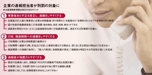 改正法では、従業員300人超の全事業者に適切な内部通報体制の整備を義務付ける。従業員300人以下の企業は努力義務だ。担当者や役員が通報者を探すなどの行為が禁止され、違反した場合、行政側から勧告などの処分を受ける可能性がある。外部への通報についても、通報者探しは禁止される。