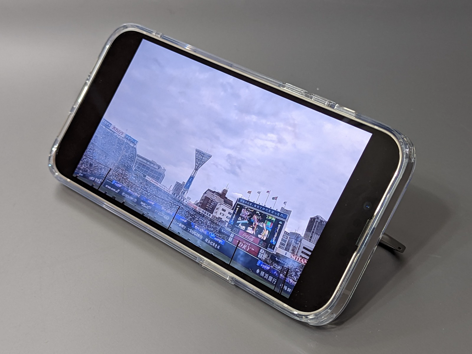 スタンドは85度まで起こすことができます。iPhoneを横向きにする場合、左側面が下でも、右側面が下でも、どちらの状態でも利用できますが、ズルズルと倒れてしまわないという意味では、左側面が下、つまりカメラ側を接地させたほうが、使い勝手は良好です。
