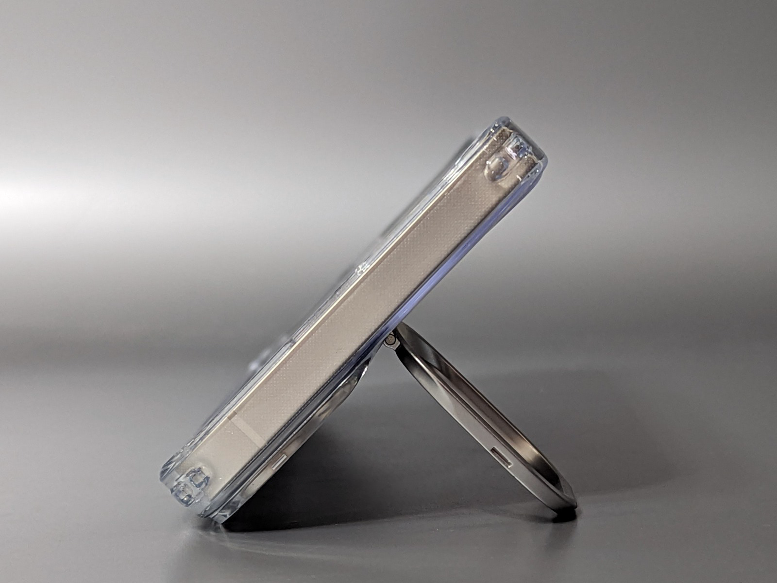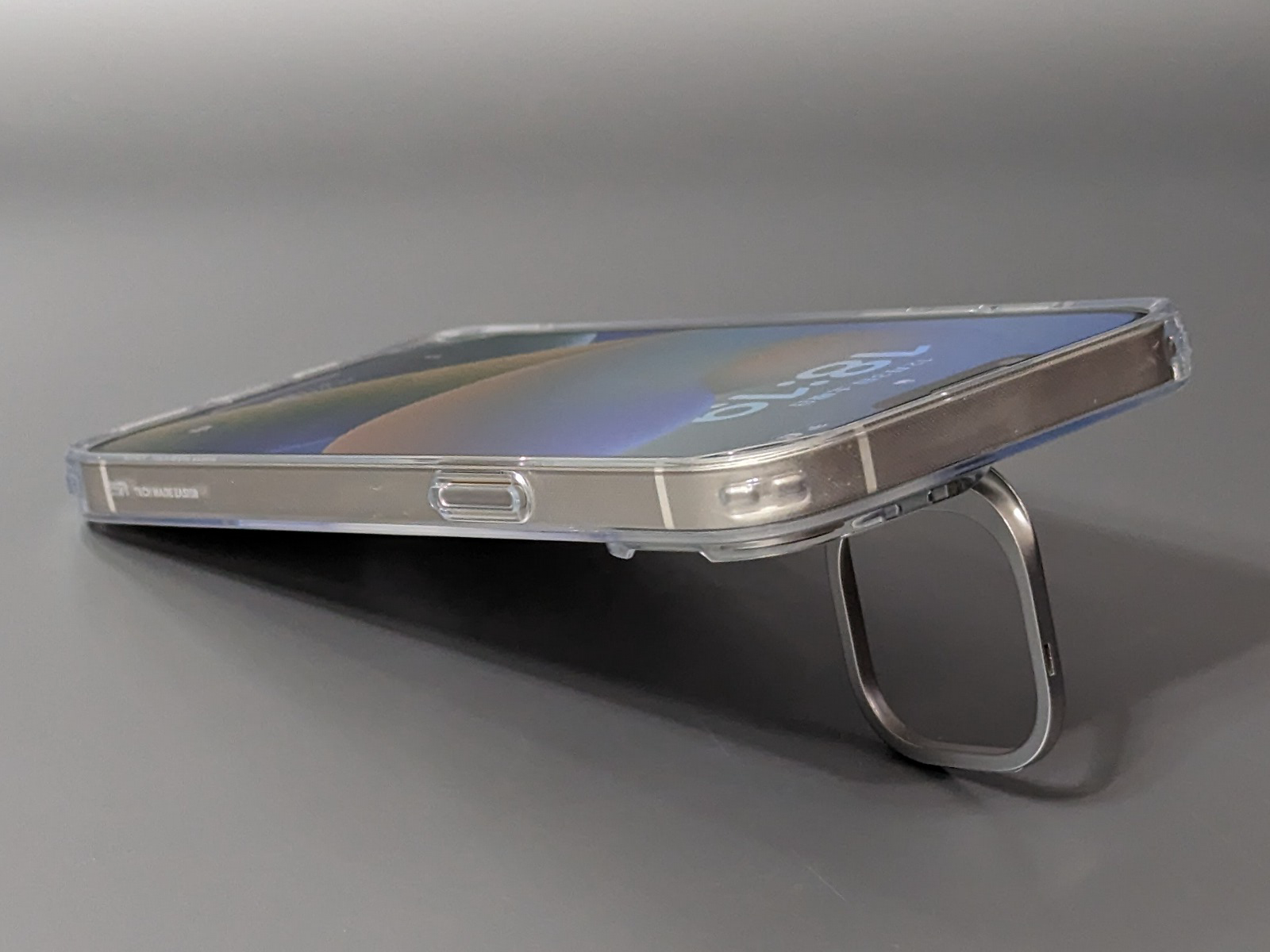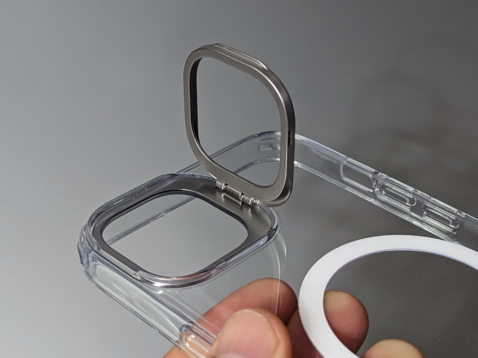 そんな本製品の利点は、スタンド機能がありながら、背面が完全に開いた状態を維持できることです。スマホバンドなどを取り付けられるだけでなく、MagSafe充電器など、磁力で吸着させられるMagSafe規格のアクセサリもそのまま利用できます。MagSafeの磁力を弱めないためのリングが内蔵されているのもプラス要因です。