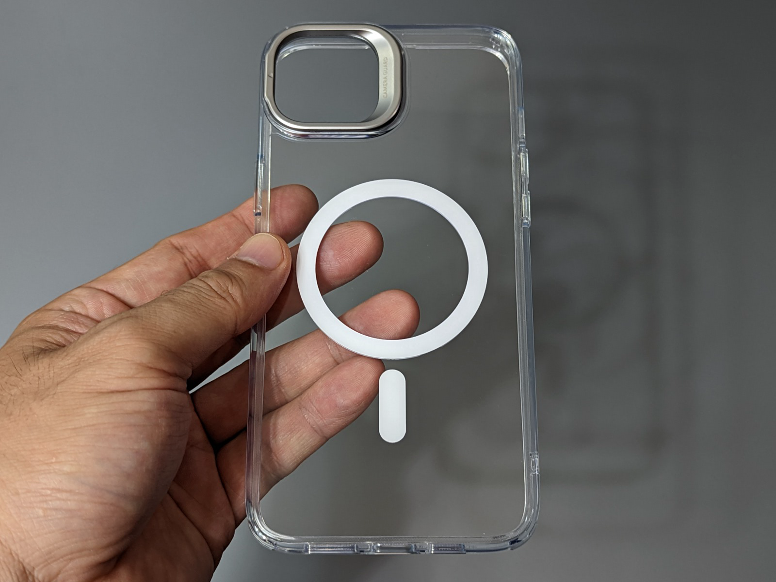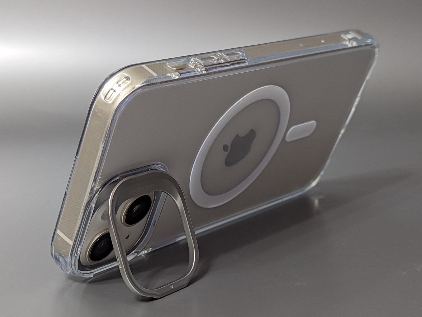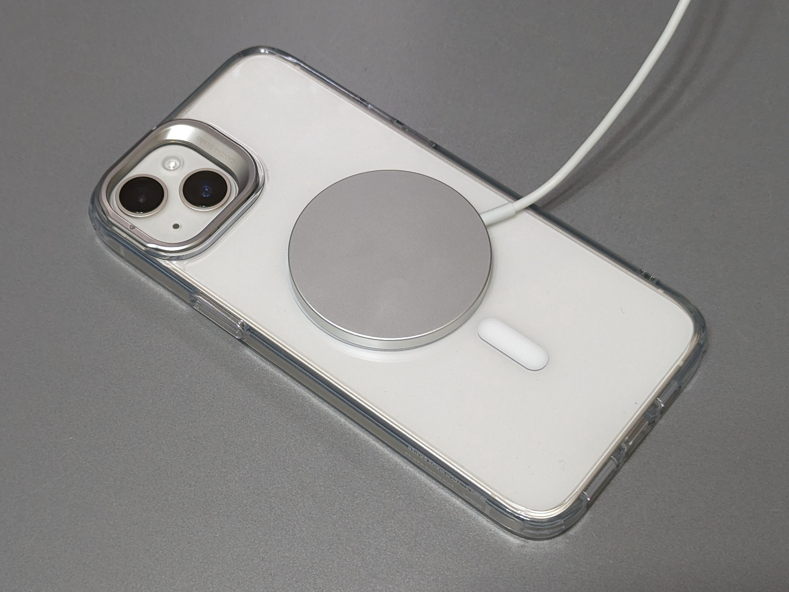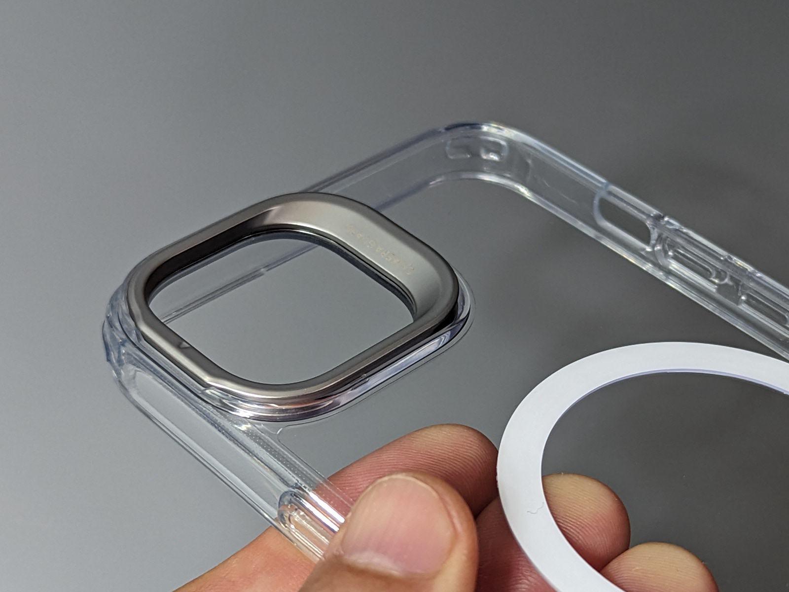 そんな本製品の利点は、スタンド機能がありながら、背面が完全に開いた状態を維持できることです。スマホバンドなどを取り付けられるだけでなく、MagSafe充電器など、磁力で吸着させられるMagSafe規格のアクセサリもそのまま利用できます。MagSafeの磁力を弱めないためのリングが内蔵されているのもプラス要因です。