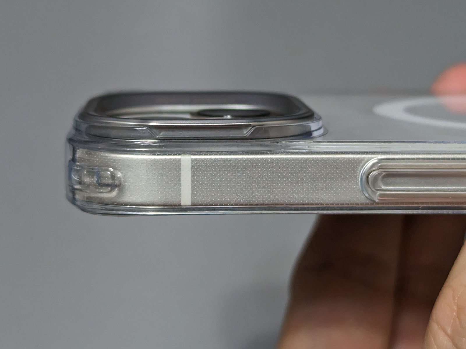 保護ケースそのものは、色は透明、背面がアクリル、周囲がTPU素材という、あまり際立った特徴のない作りですが、四隅に内蔵されたエアクッションにより保護性能は米軍の定めるMIL規格に準拠するなど高く、またストラップホールも用意するなど、必要な機能をしっかりと押さえています。極薄タイプに比べて側面にやや厚みがあるのが、唯一ユーザーを選ぶ点と言えるかもしれません。